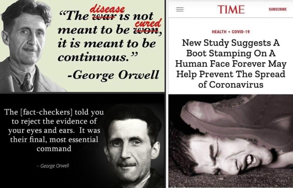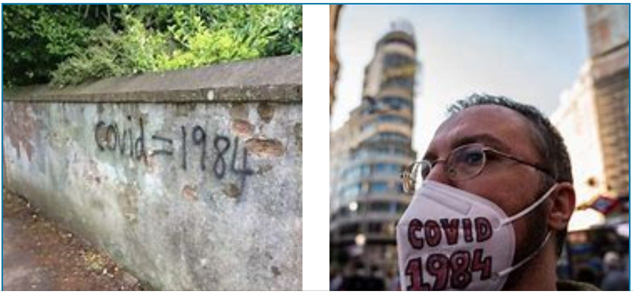 Almost immediately upon the onset of the great pseudo-pandemic of 2020-2, the name of the English novelist and essayist George Orwell, along with the title of his greatest work, enjoyed an extraordinary resurgence in public awareness, with quotations and memes proliferating all over the internet and even the streets as the relevance of his greatest work to our own times grew ever clearer. Within days of the first lockdowns, sceptics had tagged the syndrome Covid-19(84) — a formulation which encapsulated the proposition perfectly, and with an economy impossible even in Newspeak, that the emergency was being used, or had even been contrived, as a political tool.
